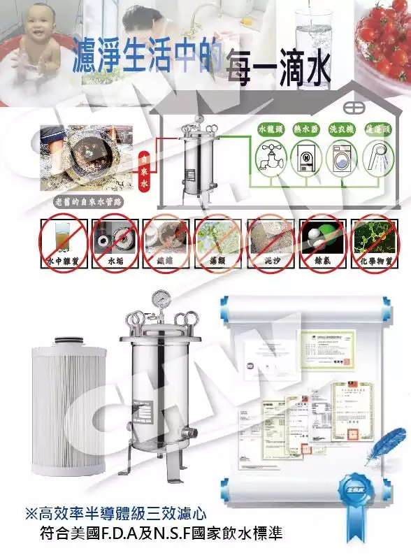 - 有效過濾泥沙、鐵鏽、等固態雜質以及去除氯、除臭、農藥、重金屬、異味及吸附化學物等。