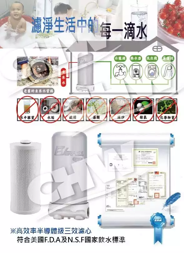 - 有效過濾泥沙、鐵鏽、等固態雜質以及去除氯、除臭、農藥、重金屬、異味及吸附化學物等。