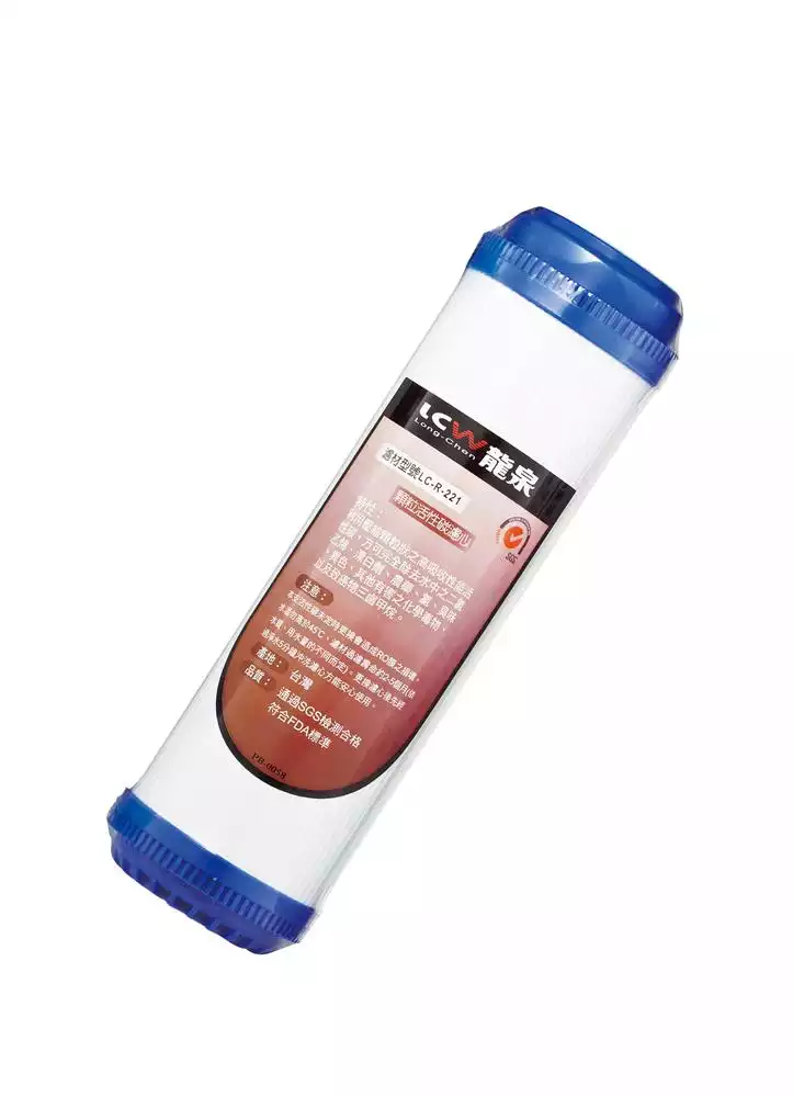 第二道~椰殼顆粒活性碳濾材(LCR-221 /LC-R-221) 規格:5微米 功能:濾除吸附臭味、異色、三鹵甲烷等有害化學物質。 週期:約3~6個月,視水質及使用情況而定。 | ![]()