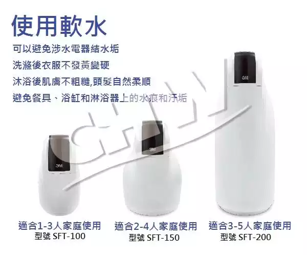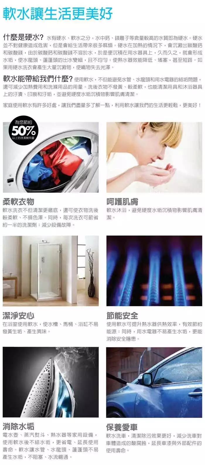 使用軟水,不但能避免水管、龍頭和用水電器的結垢問題,還可減少加熱費用和洗滌用品的用量,洗滌後衣物不發黃、不變硬,浴後肌膚不粗糙,頭髮自然柔順;也能清潔用具和沐浴器具上的污漬、印痕和汙垢,並避免硬度水垢沉積物影響肌膚清潔。