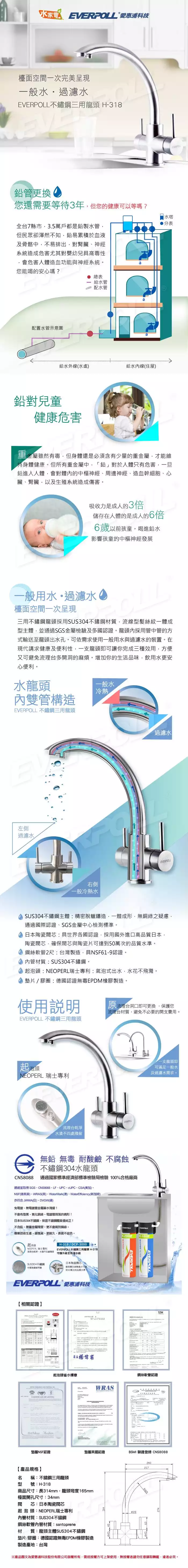 愛惠浦科技 EVERPOL L SUS304不鏽鋼三用龍頭 (H-318)