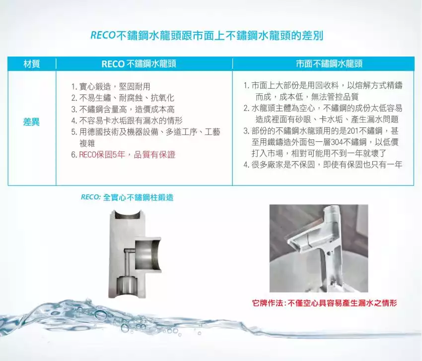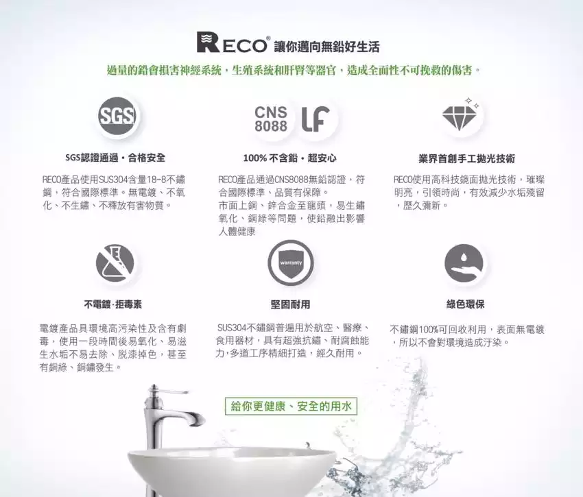 Reco為專業的不鏽鋼廚衛五金製造商,專精於水龍頭、衛浴五金配件,卓越的技術深獲歐美知名衛浴品牌的青睬,擁有多年為大品牌代工及豐富的出口經驗,也因此建立起完善的不鏽鋼製程能力。