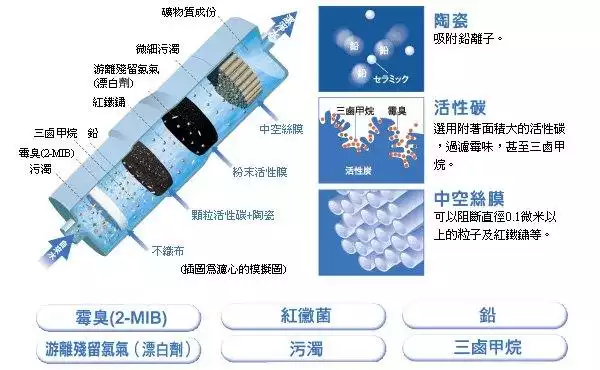 ◎可去除物質:殘留氯,污濁物,總三鹵甲烷,溶解性鉛,三氯甲烷,2-MIB(黴菌臭),二氯一溴甲烷,二溴一氯甲烷,三溴甲烷,四氯乙烯,三氯乙烯,1,11,-三氯乙烷,CAT(農藥),鐵(微粒子狀),鋁