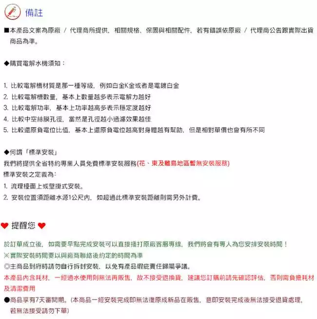 - 淨水設備、飲水機及濾心耗材一經安裝,不論使用時間長短,恕不接受退換貨。(因淨水器及濾心一經過水即無法銷售‧敬請見諒!)