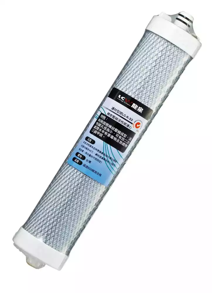第三道~椰殼塊狀活性碳濾材(LCR-33 /LC-R-33) 規格:5微米 功能:再次濾除吸附臭味、異色、三鹵甲烷等有害化學物質。 週期:約3~6個月,視水質及使用情況而定。 | ![]()