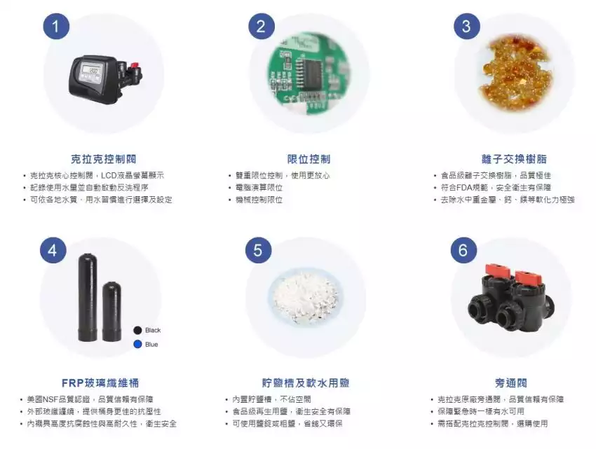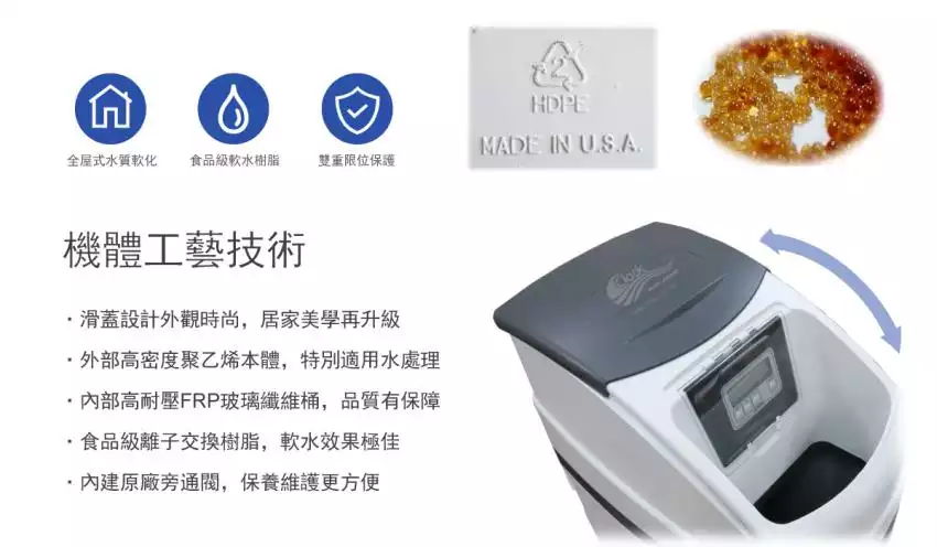 有效過濾水中的石灰質、水垢及鈣鎂離子,軟化生活用水從硬水變成軟水。