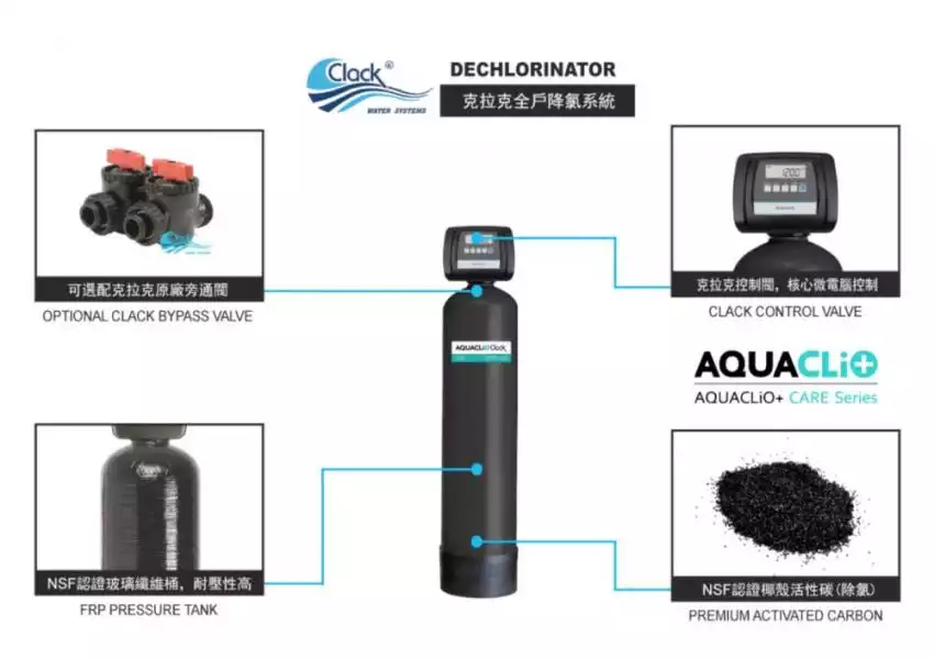 AQUACLiO+ CARE 智慧高效降氣淨水系統,克拉克多彩光學控制閥搭配椰殼活性碳,可選擇除織或降氯功能,有效過濾水中餘氯,遠離氯對人體、皮膚、頭髮及呼吸道的傷害。