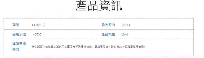 - 建議更換時間9-12個月 (依地區水質與用水量而有不同濾淨效能,更換濾芯後,請放流灰水至清澈後再使用)。