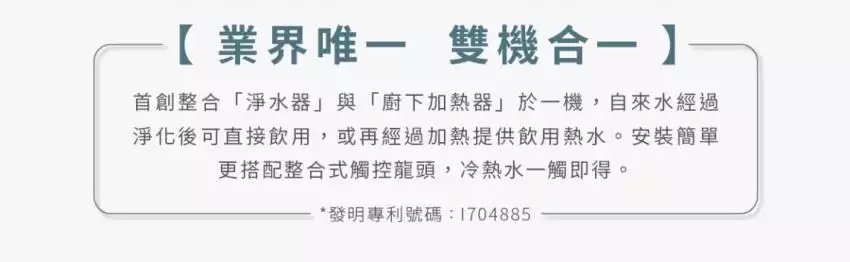 - 業界唯一,淨水+熱水兩機合一