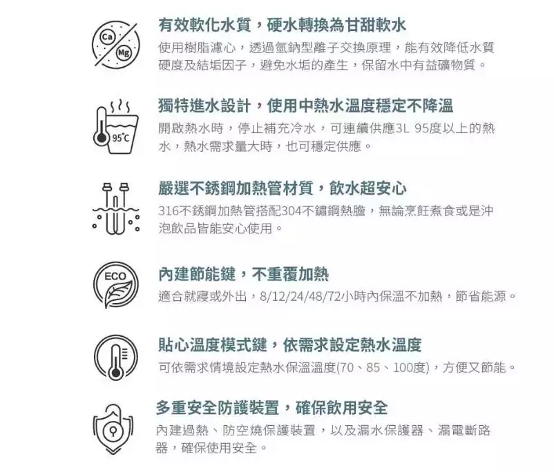 - 內建軟水淨水模組,降低水垢
