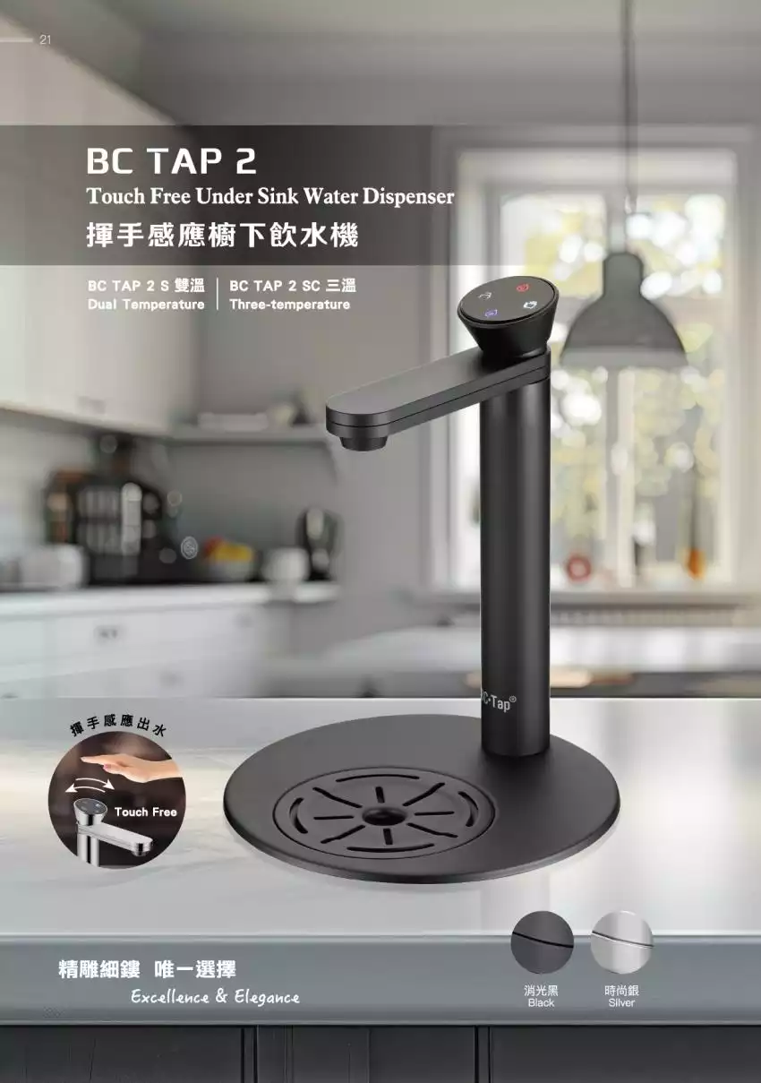 BC Tap 2 櫥下型冰溫熱飲水機結合了專利 M585889 智能照明光感應技術,開燈即開機、關燈即關機,免除傳統需每天設定開關的困擾。