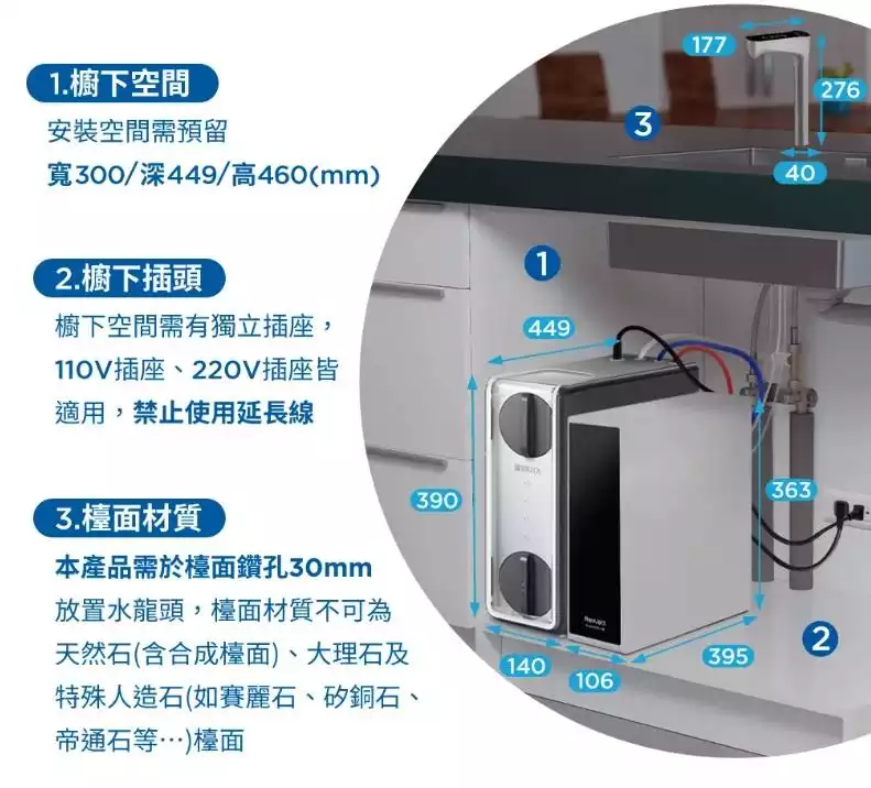 ‧原水水壓只少須有(1.5kg)的壓力,若水壓太低,需自費裝加壓馬達提高水壓<安裝加壓馬達費用需另計>