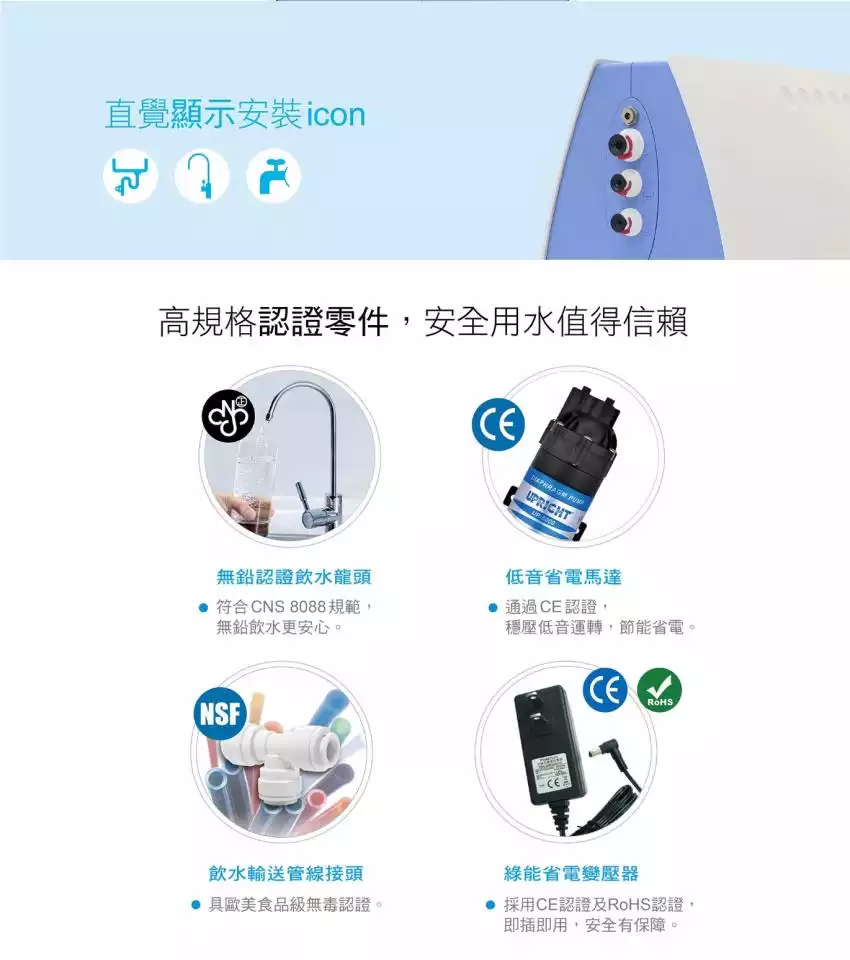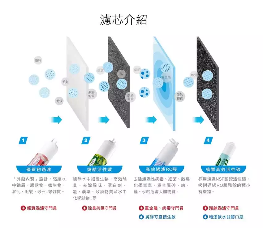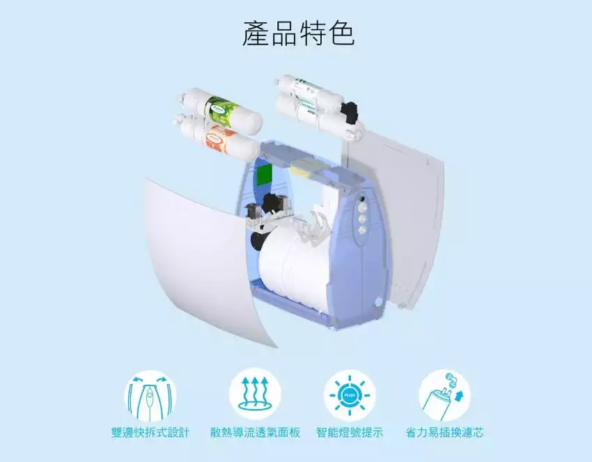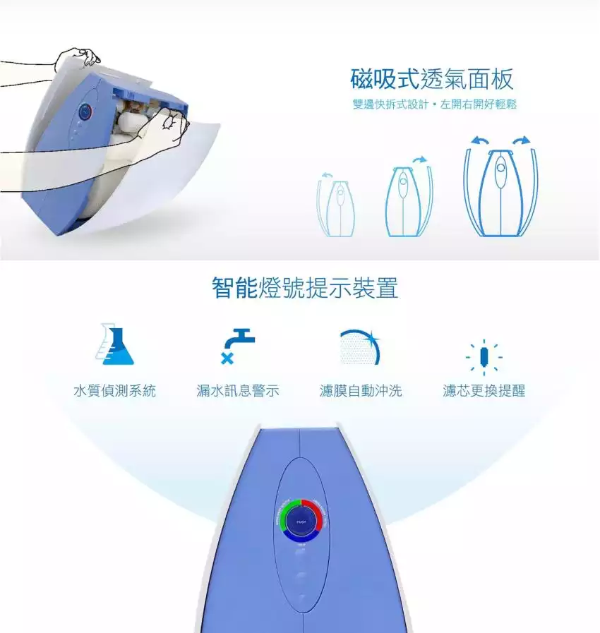 - 濾芯更換提醒、水質全天健診、系統漏水監控、RO膜自動沖洗