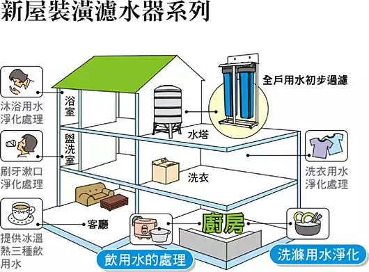 全戶式過濾器能有效去除水中餘氯,並淨化200噸的自來水更可去除水中之大腸桿菌、氯、三氯甲烷、重金屬、農藥、硝酸鹽氯、雜質、腐植酸、微囊藻毒、異味、鐵銹等有害物質。